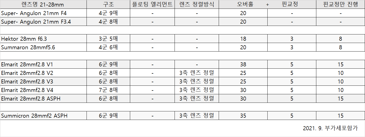 - 렌즈의 작업 비용은 종류와 구조에 따라 상이하기 때문에 각 렌즈별로 작업비용이 다르게 설정됩니다. 또한 과거 핀교정 금액을 오버홀에 포함시켰으나 선반 가공 등 별도의 시간이 핀교정 과정에 소요되어 소정의 공임을 추가, 작업비용을 현실화 하였습니다. 리스트에 나오지 않은 렌즈는 다음과 같은 방법으로 객관화 하여 대략적인 작업비용을 예상하실 수 있습니다. 특별한 경우가 아닌 이상 아래 표의 견적과 동일하게 진행되며 추가 견적이 필요한 경우 사전 고지를 통해 진행합니다.