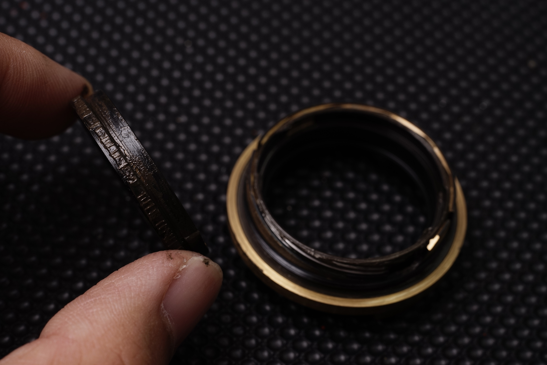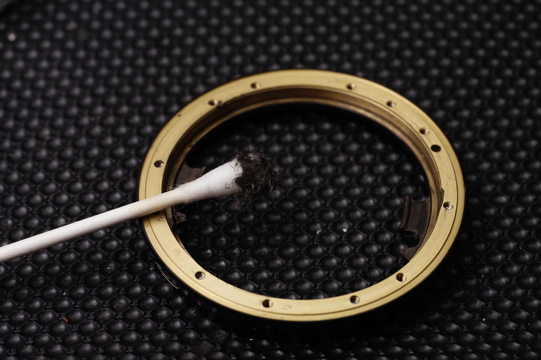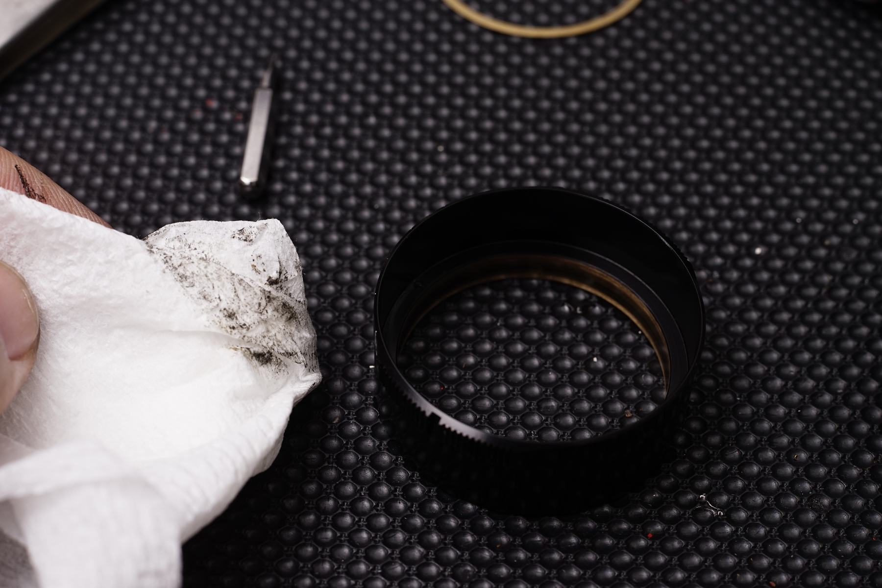 렌즈와 금속 하우징의 틈에 고여있는 윤활유가 제법 되었고