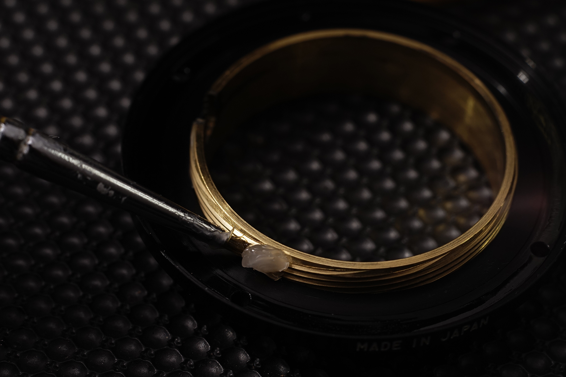 조리개의 움직임을 끊어주는 클릭스탑의 위치와 적절한 토크를 주기 위해 배합된 윤활유를 도포하는 사진.