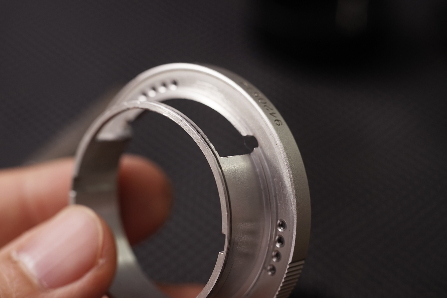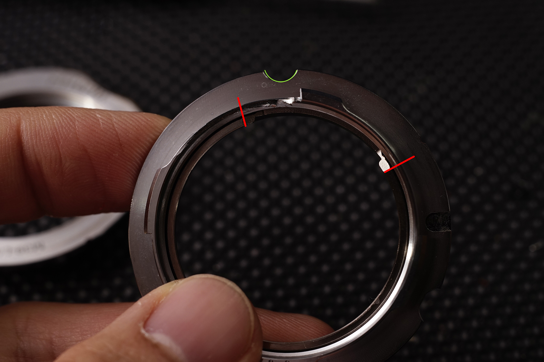 이게 중국산 어뎁터, 심지어 같은 브랜드의 어뎁터라고 해도 시작지점이 중구난방이기 때문에 일일히 렌즈를 장착을 해봐야 알 수 있습니다. (사진은 이해가 쉽도록 렌즈의 분리된 렌즈의 마운트 부분을 체결한 것으로 렌즈를 마운트해도 동일한 위치가 되어야합니다.)
