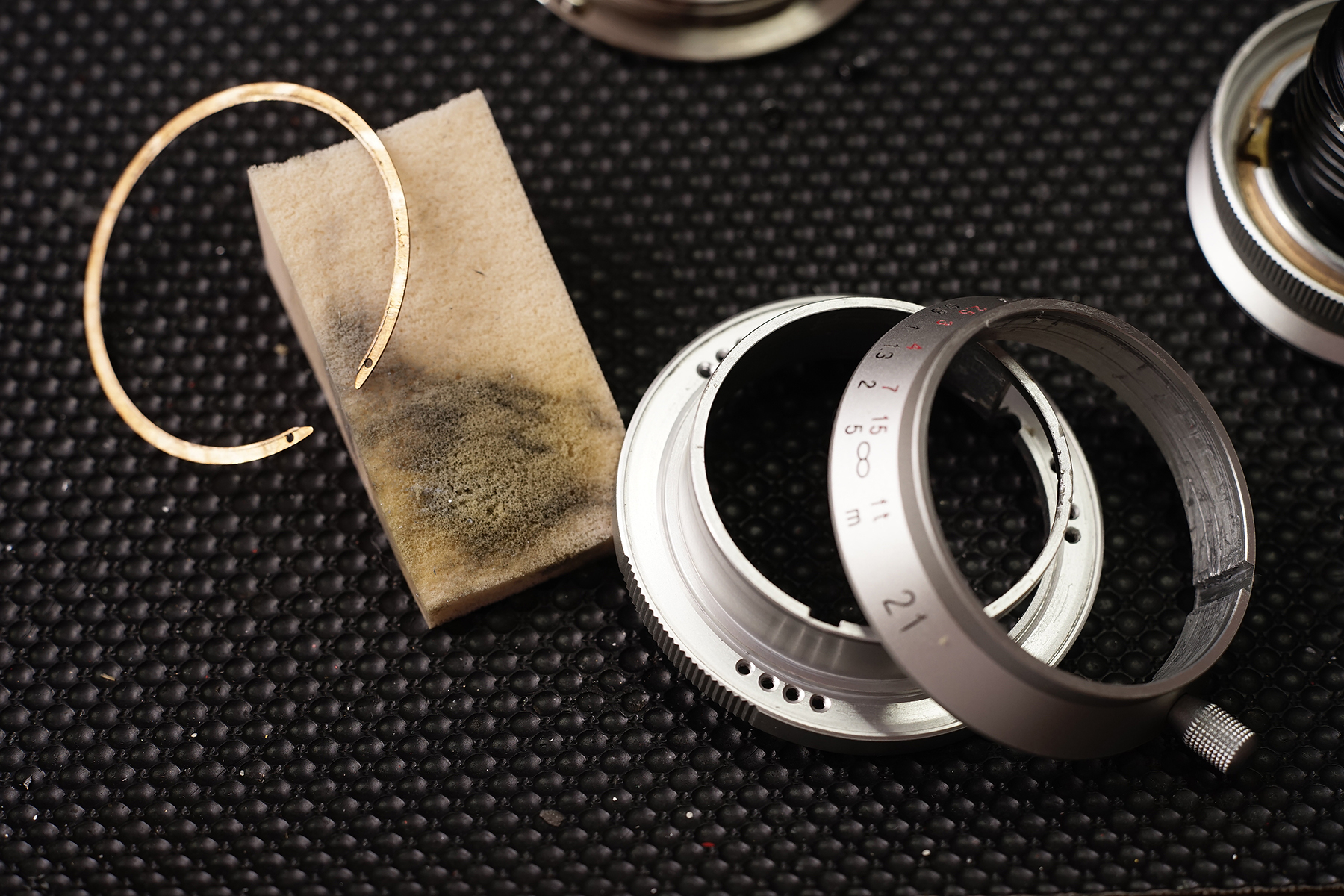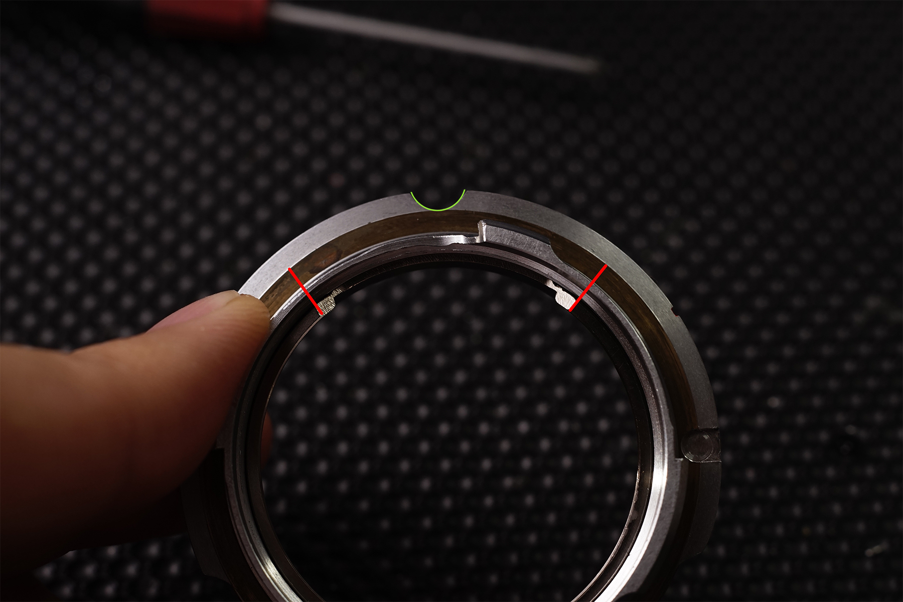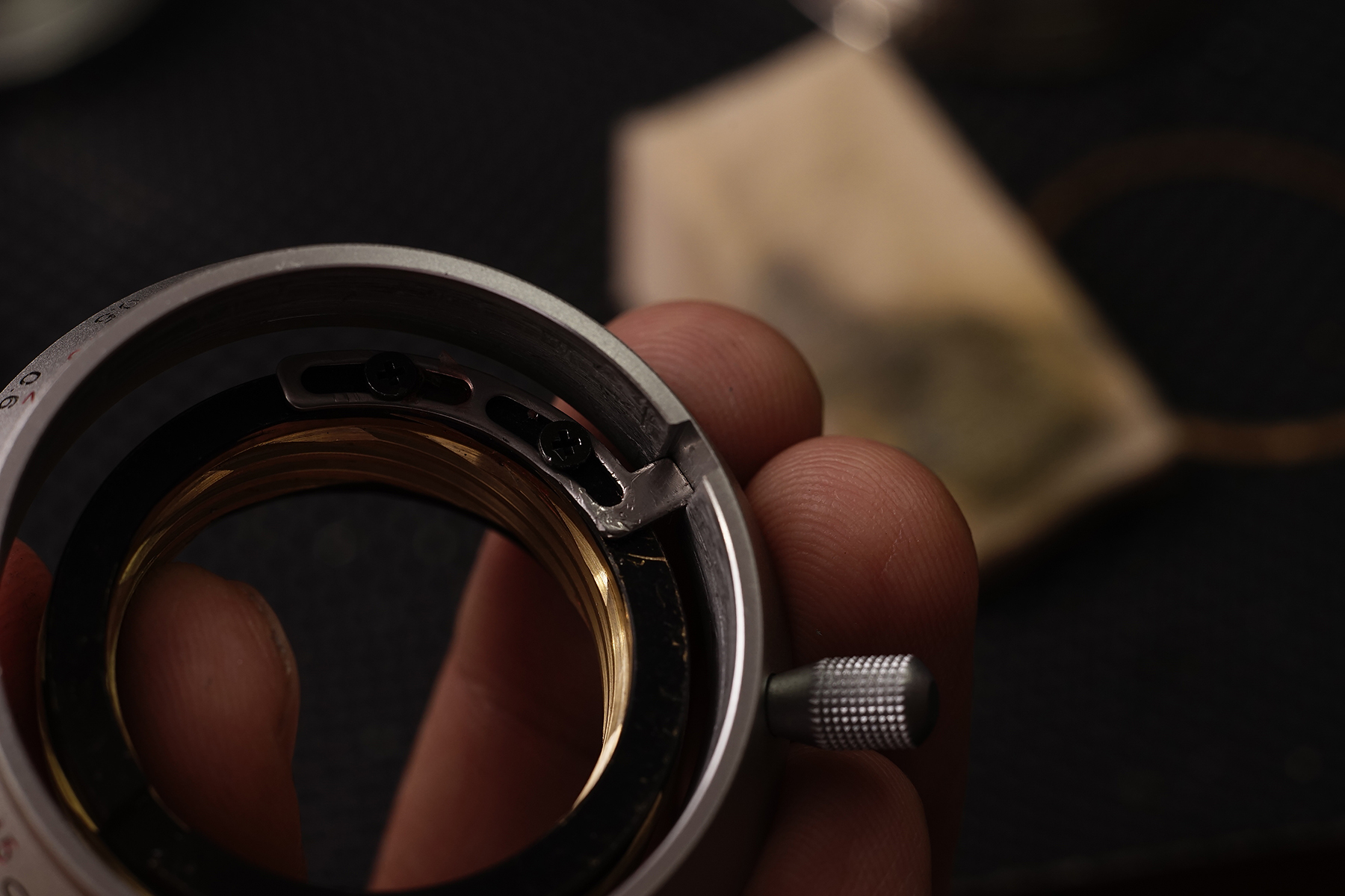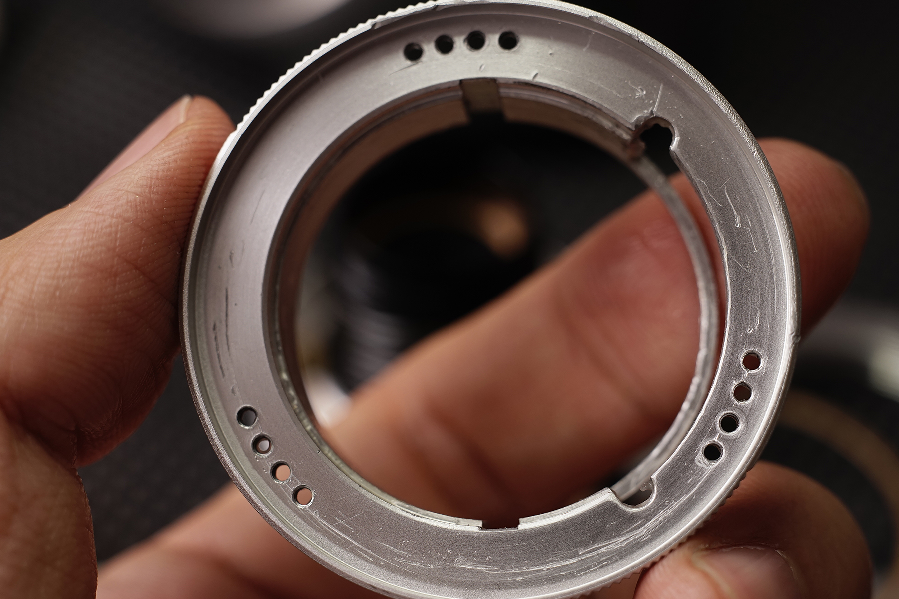 앞서 말씀드렸던 LTM 어뎁터에 따른 센터 문제입니다. 스크류 특성상 저 부분이 센터로 오지 않으면 포커싱 및 이중상 무한대 일치 등의 문제가 발생하게 됩니다. 21mm 같은 광각의 경우 심도가 깊기 때문에 사진과 같이 오차가 심하지 않은 경우는 그냥 사용해도 무방하나 50, 35mm 정도면 핀오차가 발생하거나 심한 경우 중-근거리 포커싱연동이 되지 않습니다.