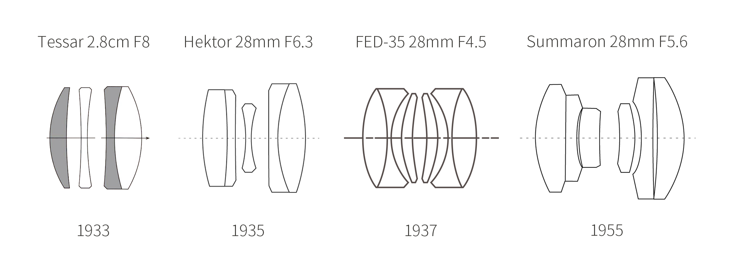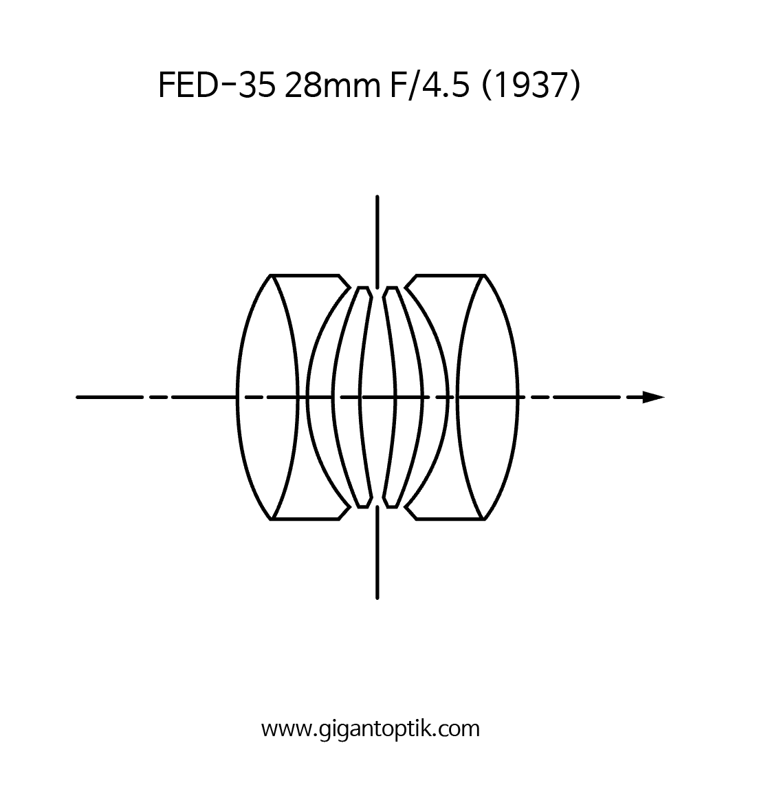 1937-1941년(39?) 우크라이나의 하르키우/ Kharkiv (하리코프/Kharkov Dzerzhinsky)에서 생산된 FED-35 28mm F4.5는 외형은 마치 스크류마운트의 헥토르 28mm와 매우 유사하지만 설계 자체는 다른 가우스 타입의 4군 6매 형식의 독자적인 형식이다. 웹상에는 6매의 렌즈가 모두 접착되지 않은 단면도도 보이지만 이는 렌즈 전개도를 잘못 해석한 것으로 분해 확인 결과 1군과 4군의 렌즈는 분명히 접착되어있다.
