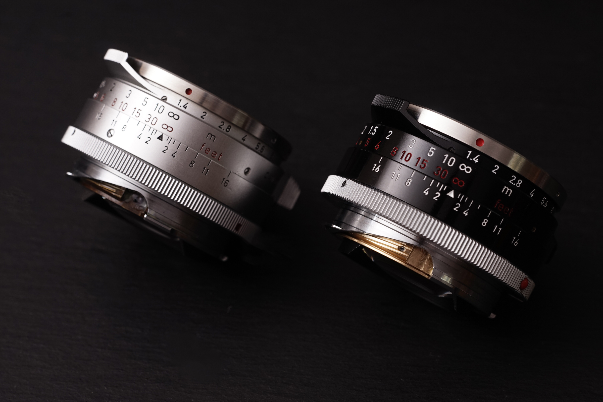 외관에서의 차이는 거의 느껴지지 않을 정도로 동일한 구성과 폰트를 적용하고 있습니다. 포커스 탭에 달린 인피닛 락 버튼의 디자인과 구성 방식까지 동일하게 재현하였고 특히 Summilux 35mm F1.4 V1 Steel Rim과 V2 초기형과 동일하게 4군을 본체에 고정하는 리테이닝 링도 단가 상승을 신경쓰지 않고 동일하게 카피하였습니다.