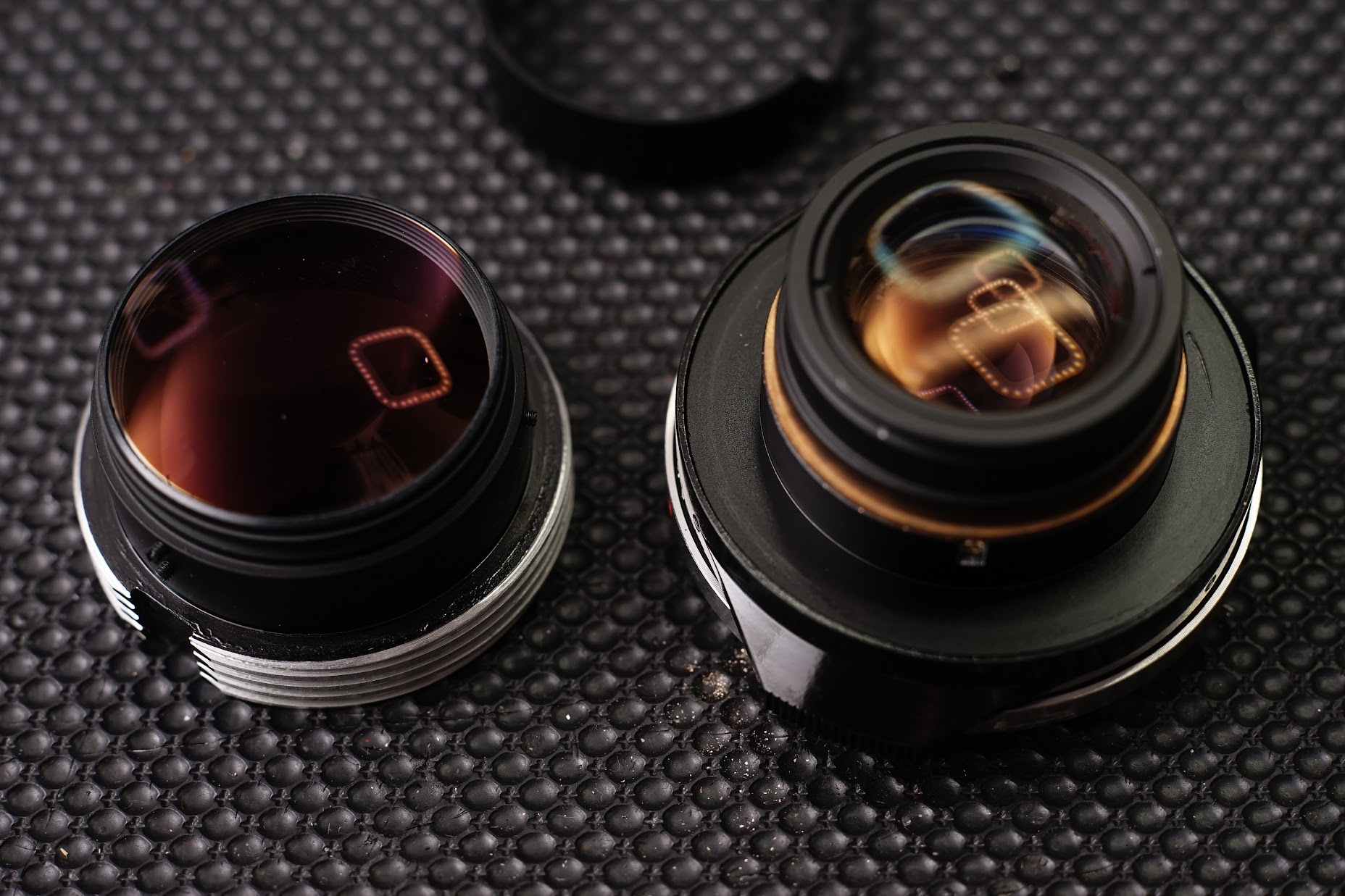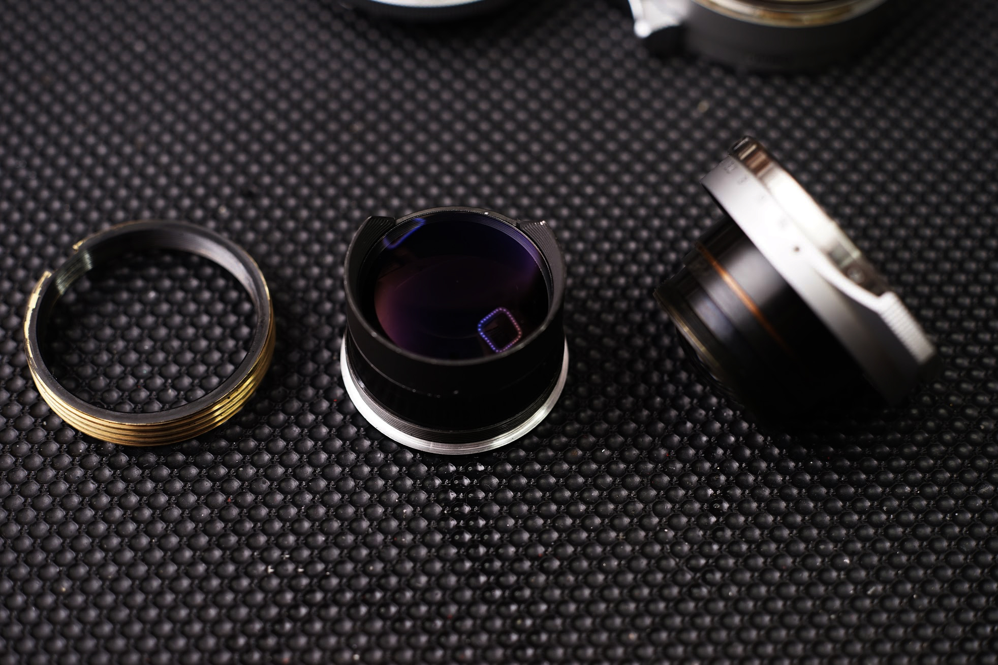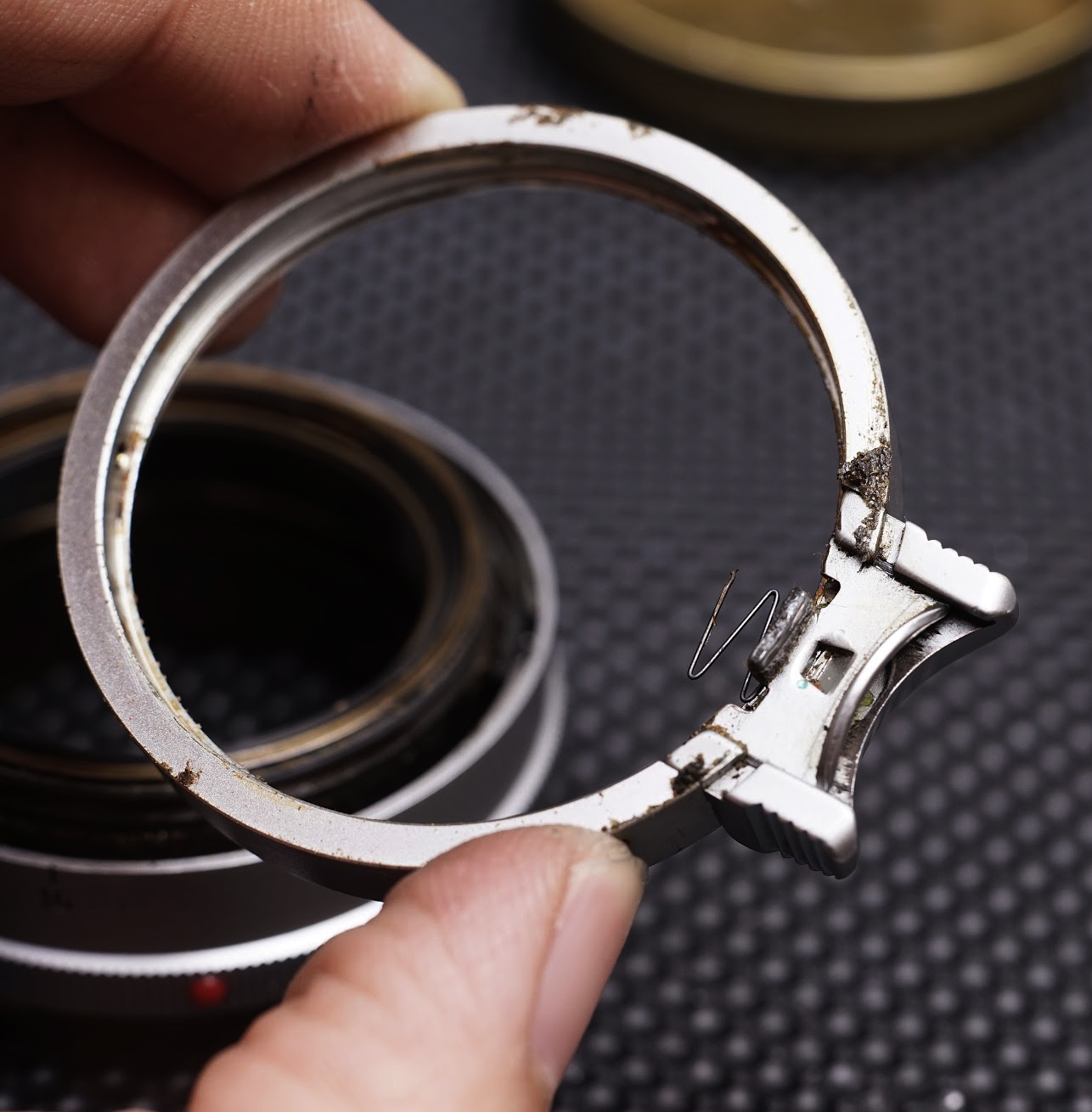 고정력을 강화하기 위해 나사가 더 박혀 있는 모습과 일체형인 헬리코이드의 차이점, 라이카는 황동제 헬리코이드가 따로 분리되는 방식으로 렌즈 자체의 플렌지 조정이 가능한 전통적 구조.