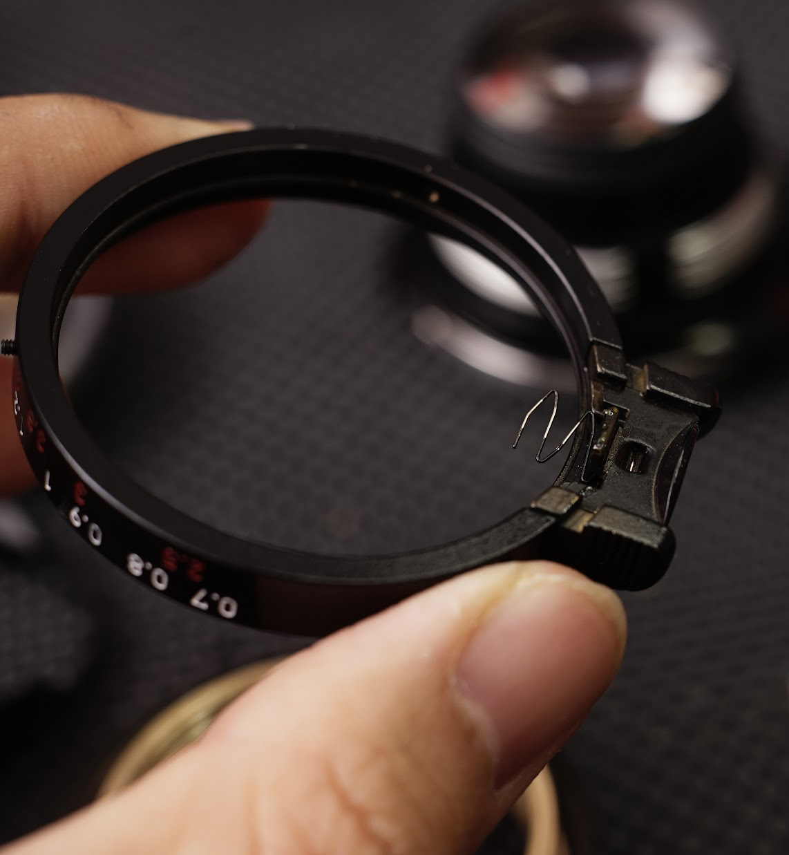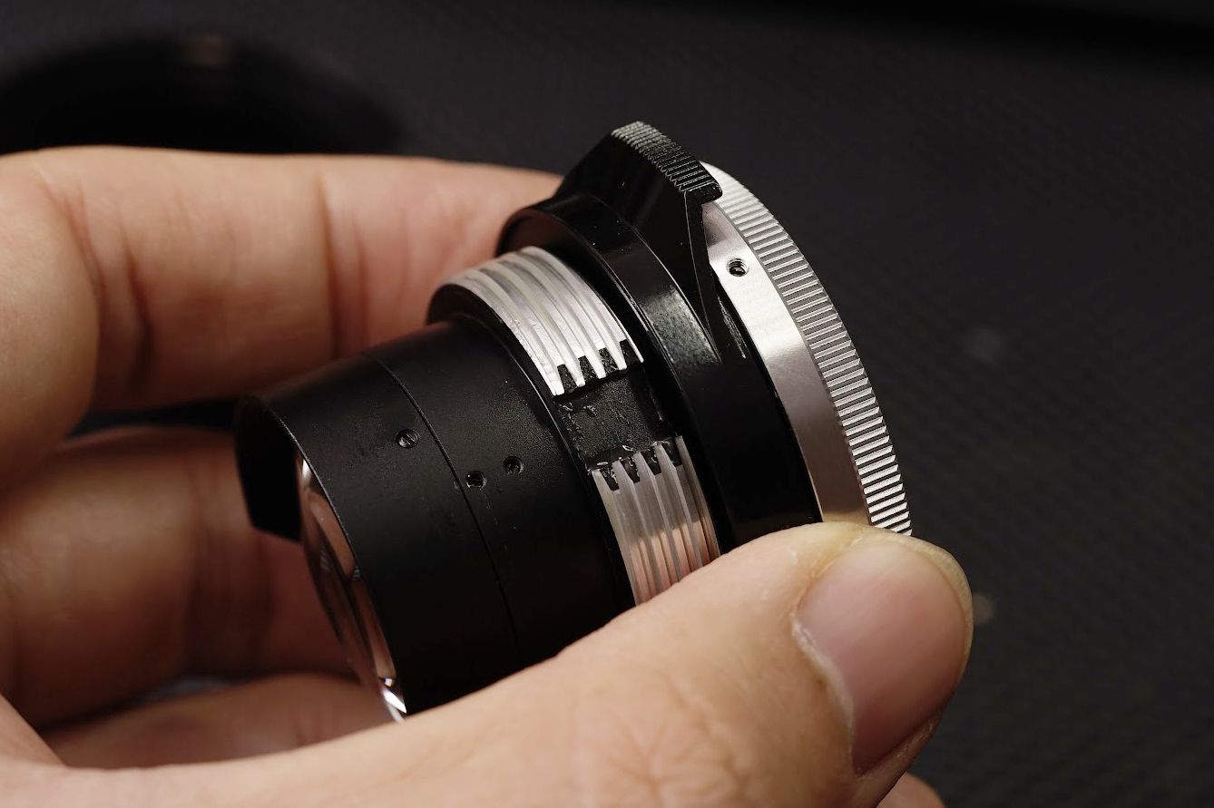 후옥과 헬리코이드 부품이 일체형(Peace Lens/Left), 황동 헬리코이드 부품이 따로 분리되어있는 스틸림(Leitz/Right), Summilux-M 35mm F1.4 V1 Steel Rim의 설계 문제로 지적되는 전용후드(OLLUX/12522)와 함께 사용시 조리개 지시선이 무한대 표시점에서 틀어지는 문제를 해결하고자 이 부분이 스크류로 잠그는 방식 대신 일체형으로 설계가 된 부분을 볼 수 있습니다. 대신 나사를 3개 배치하여 고정력을 높이고 조립시 원하는 위치로 무한대표시와 조리개 표시를 자유롭게 고정 할 수 있게 되어있습니다. 그러나 렌즈 자체의 무한대 조정은 불가능하며 단지 연동캠과 연동되는 헬리코이드 부분의 조정을 통해 핀교정이 가능한 방식입니다. 흔히 중국에서 마운트 개조되는 렌즈나 어뎁터에서 주로 사용하는 방식으로 이 경우 무한대에서의 이중상은 일치하지 않을 수 있으나 사용시 정확한 핀은 맞출수 있는 구조입니다.
