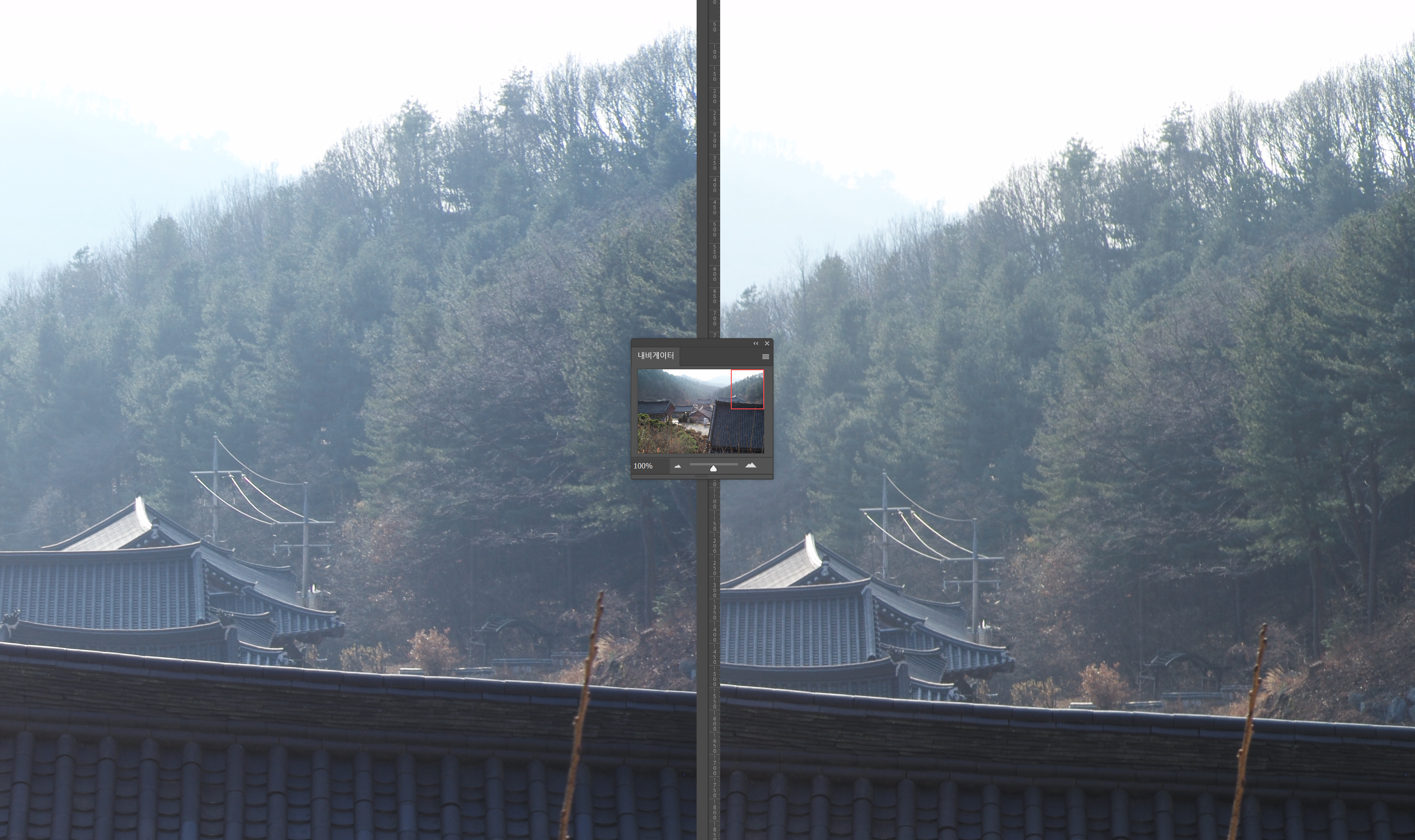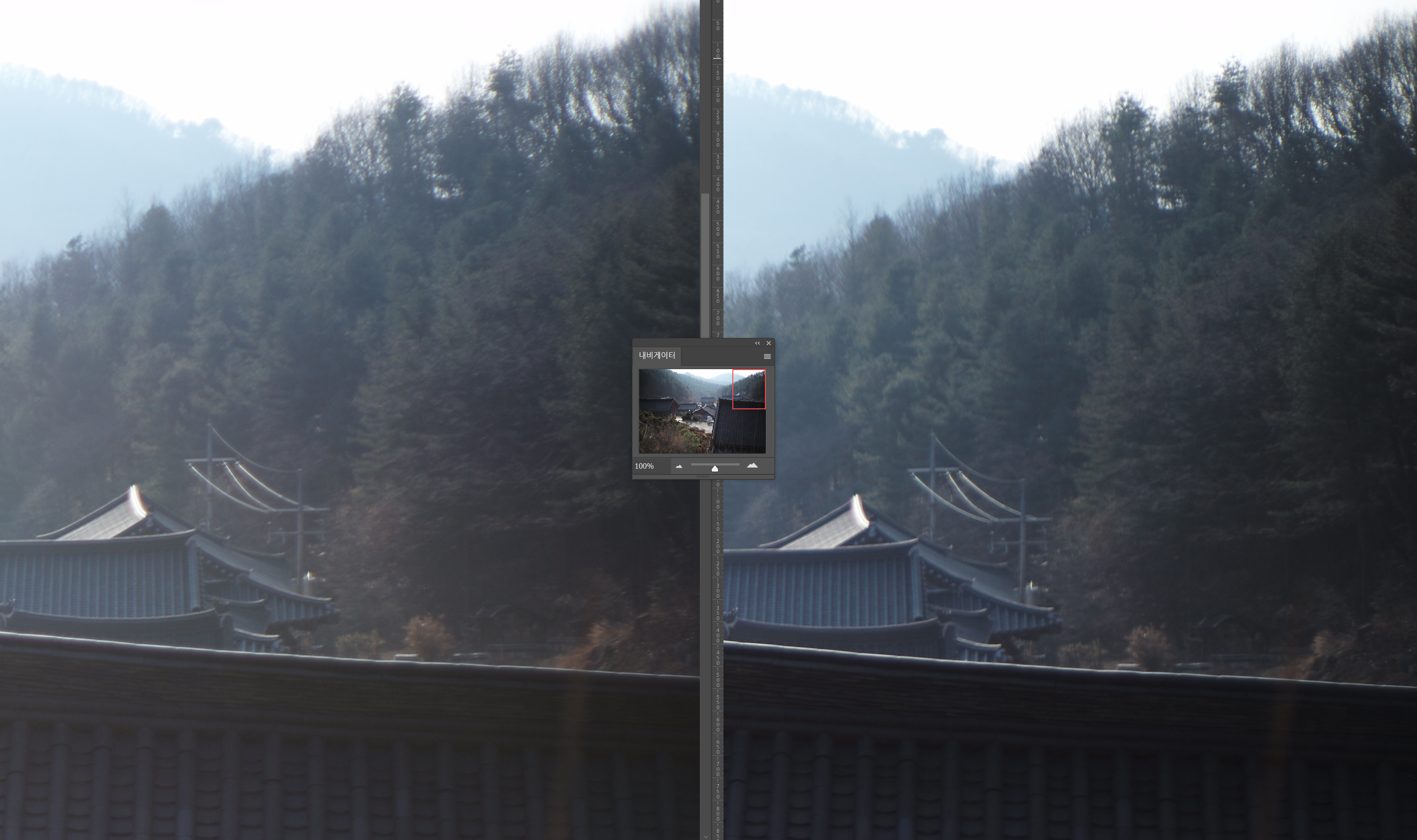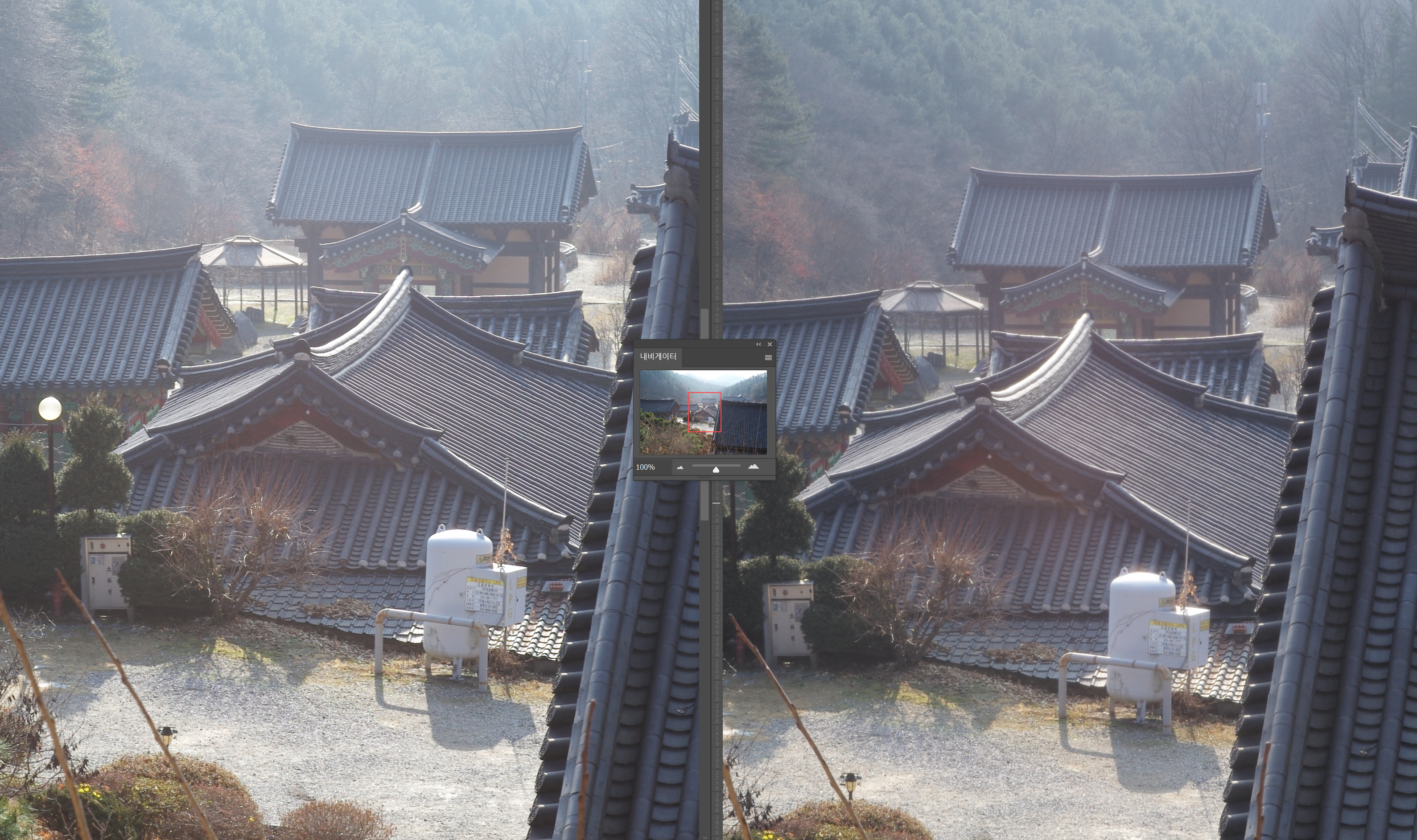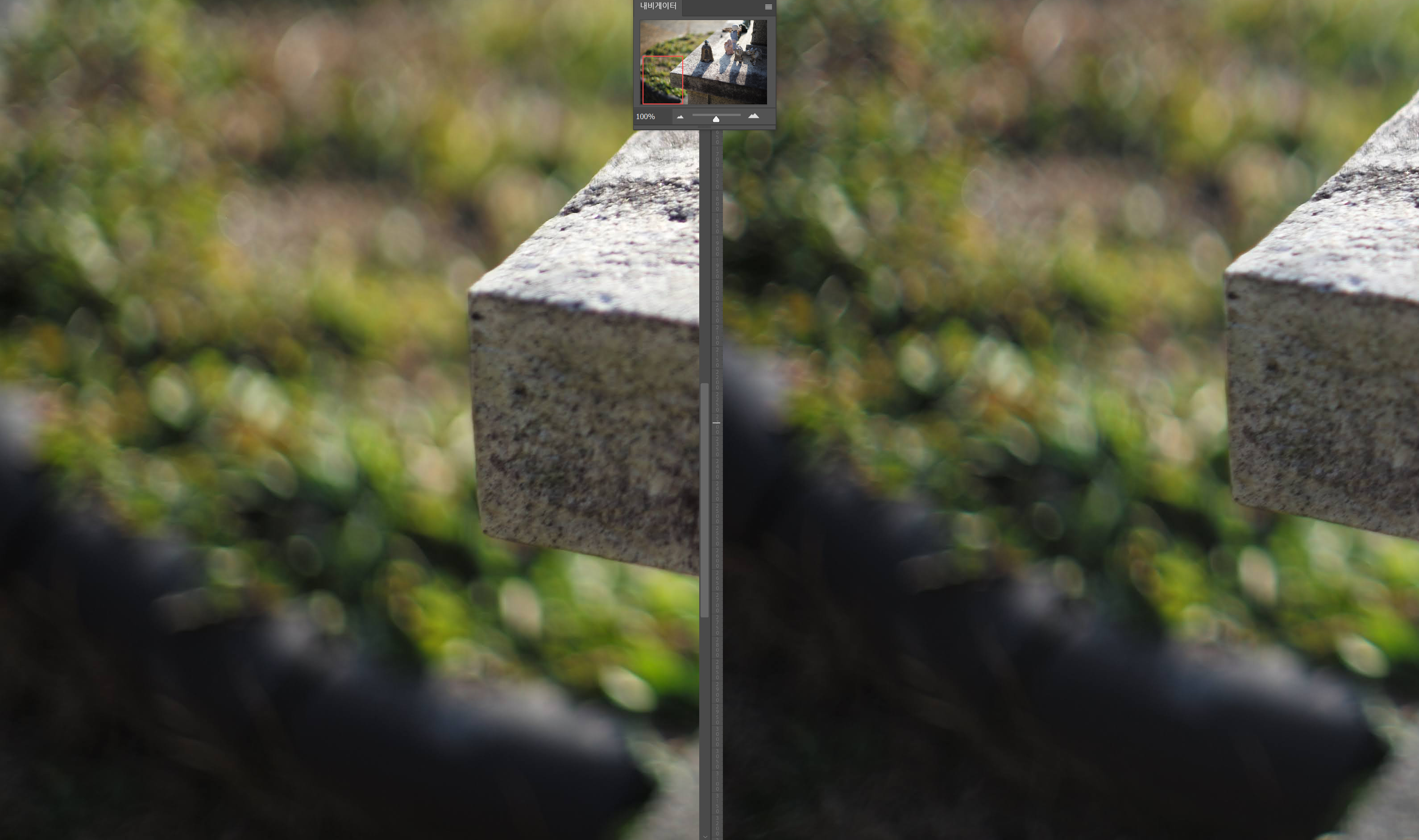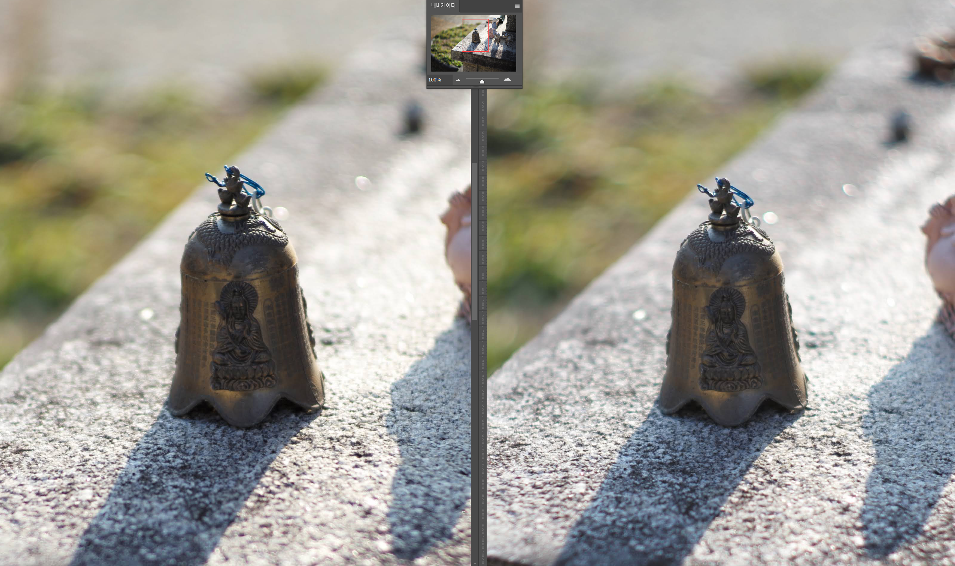 F8에서의 무한대 해상력 테스트입니다. 조리개를 조이면 컨트라스트 및 해상력 모두 구분하기 어려운 수준으로 올라옵니다. 오히려 글로우는 Peace Lens 쪽이 반사되는 빛을 약간 놓치는 듯한 현상이 보입니다. 주변부 역시 두 렌즈 비슷한 성능입니다.